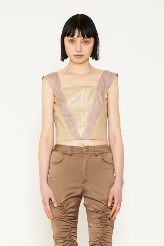 フェイクレザー・フェイクスウェードの組み合わせでvintageの雰囲気を演出。 裏地にメッシュを使用し、胸元にはゴムを入れフィットする仕様に。 肩紐を下ろしてオフショルダーで着るのもお勧めです。