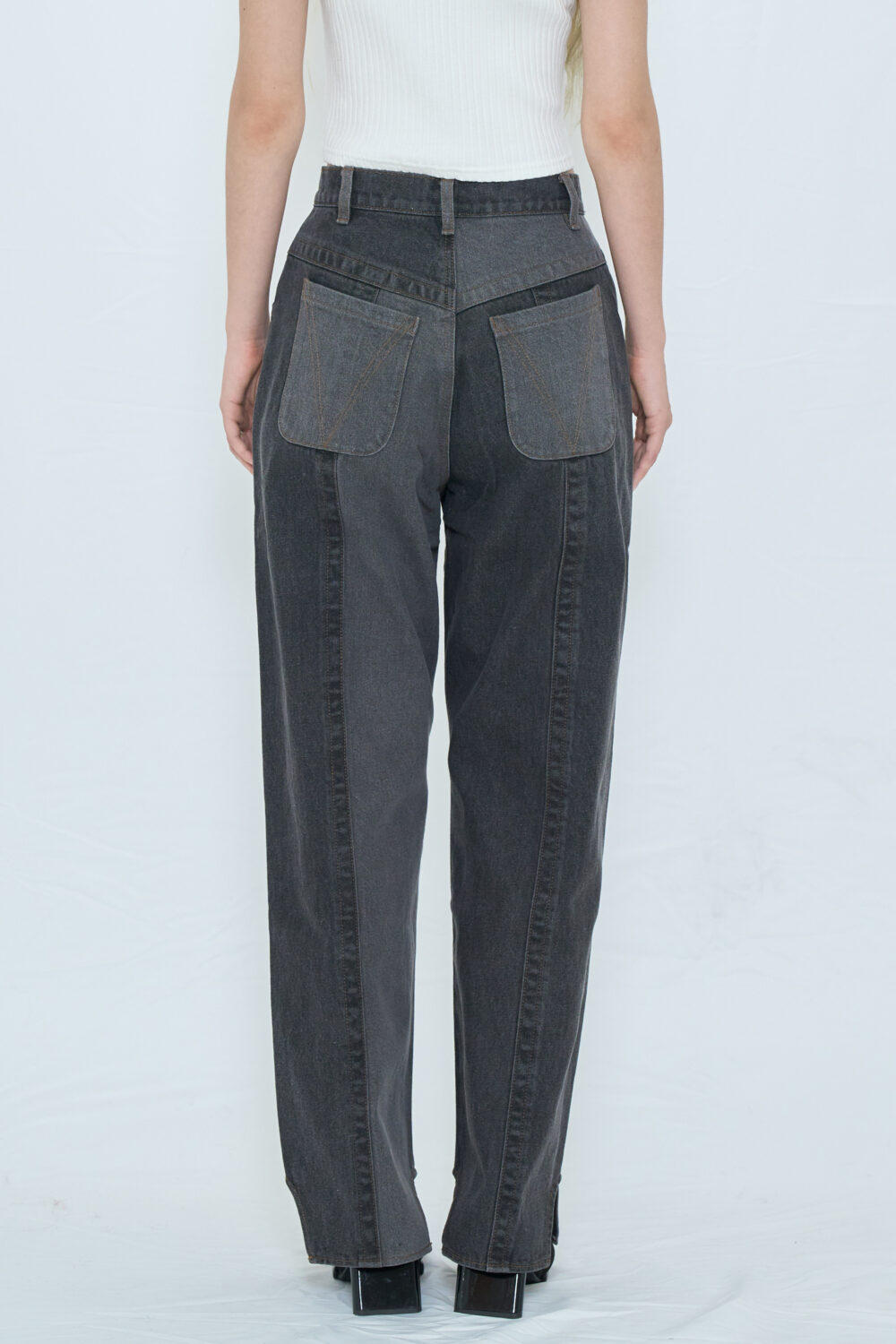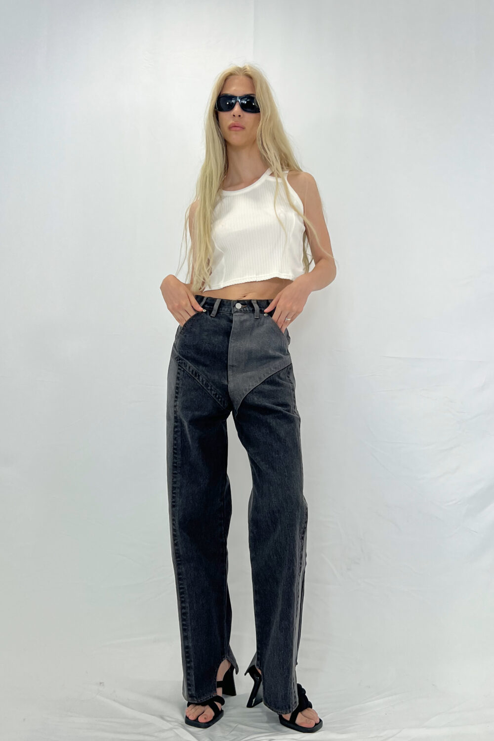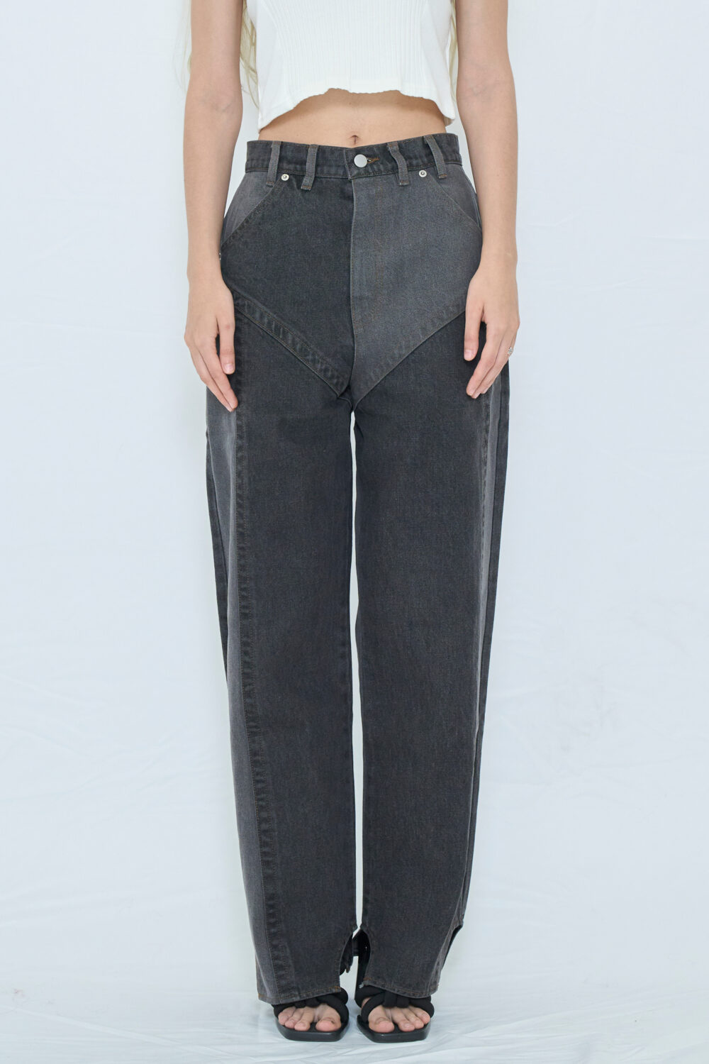 切替位置とハイウエストの組み合わせで縦のラインを強調。