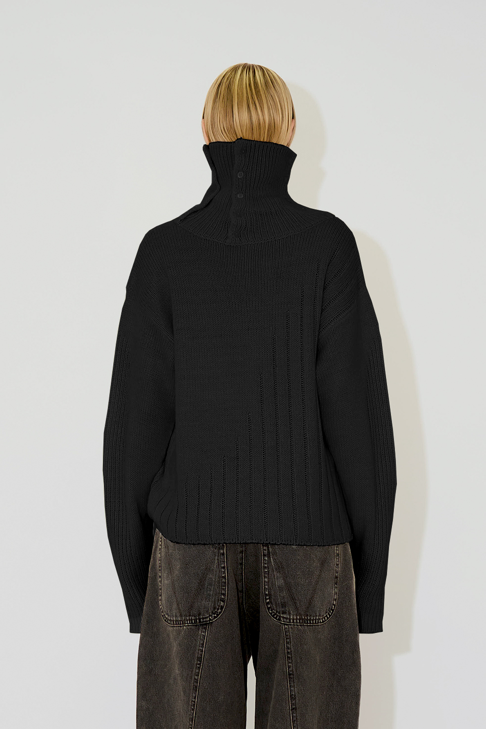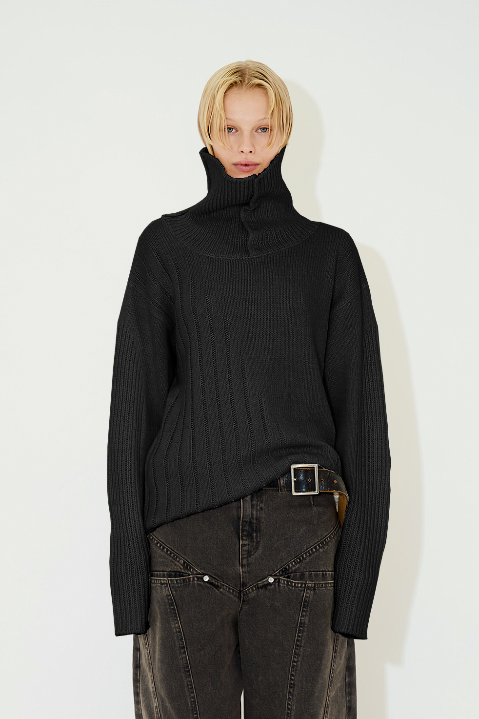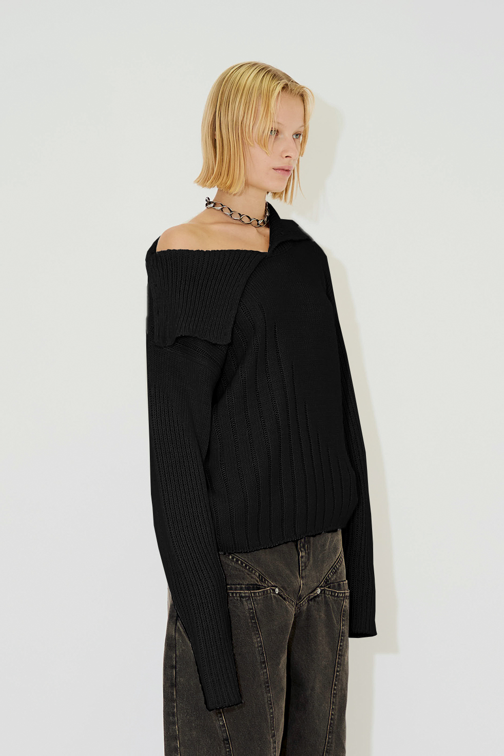 ハイネック部分の切替により、ビックカラー風やオフショルダーとしても着用可能。