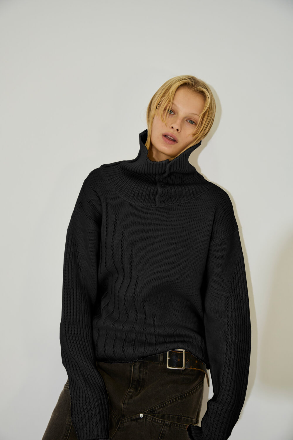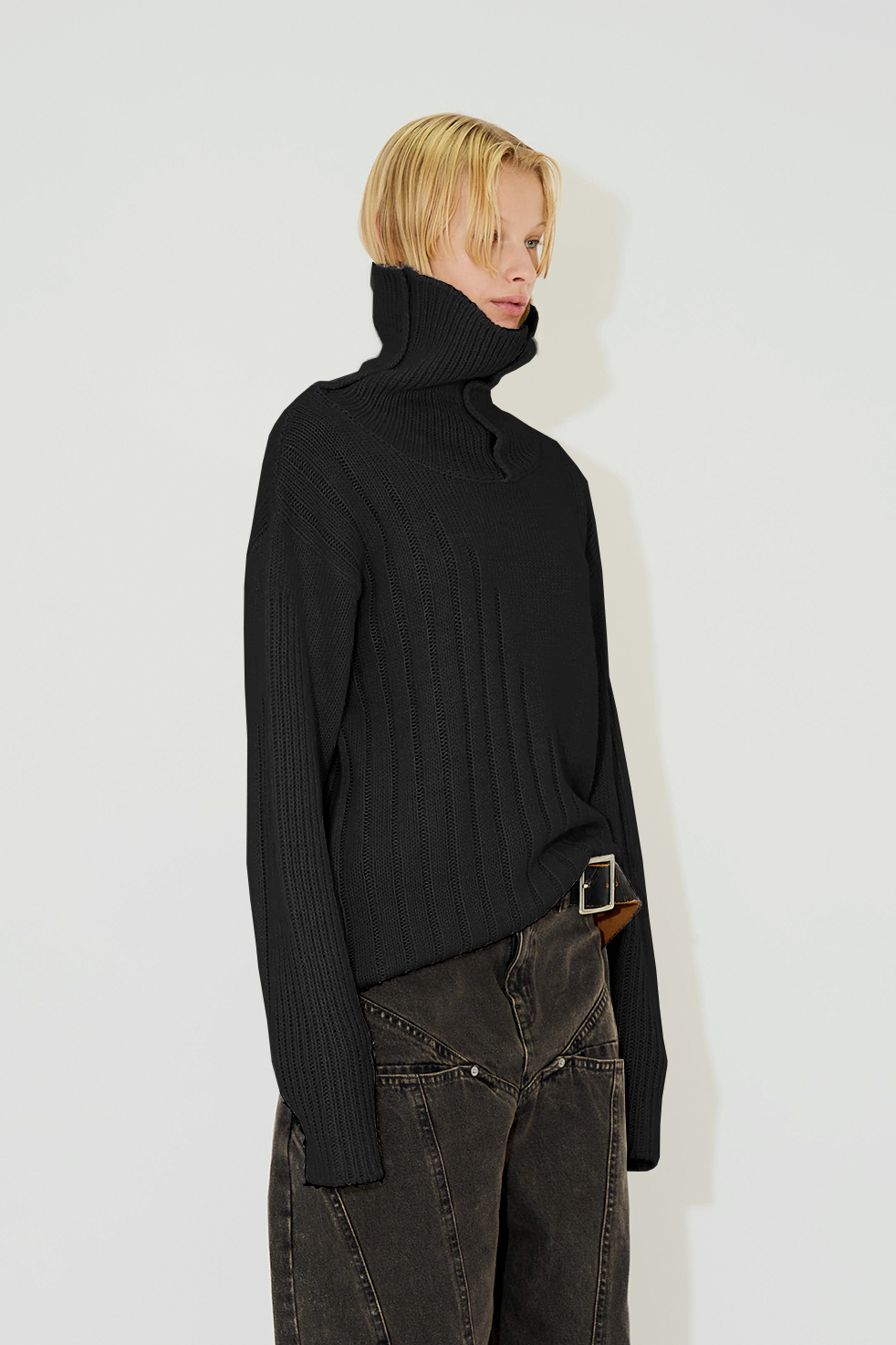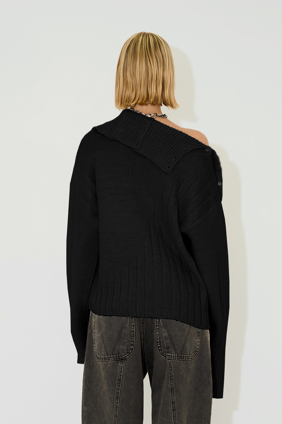 ハイネック部分の切替により、ビックカラー風やオフショルダーとしても着用可能。