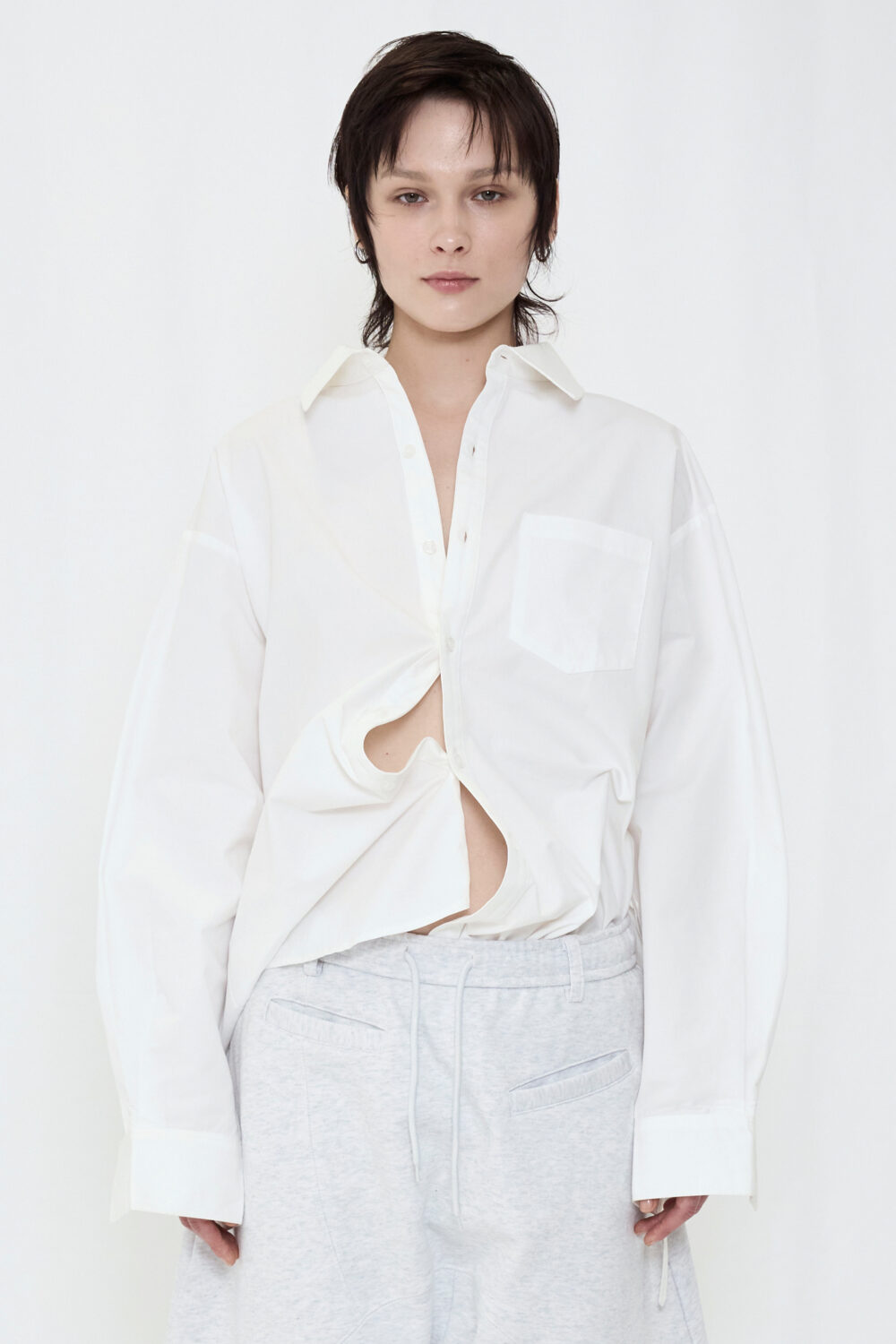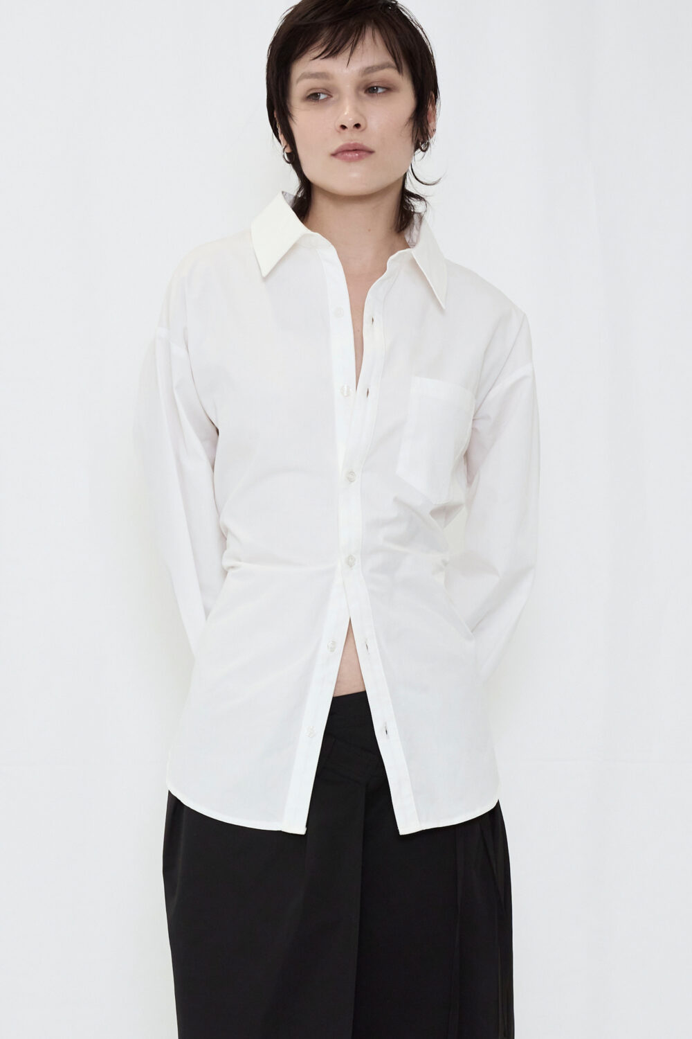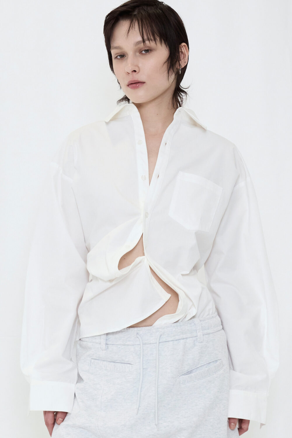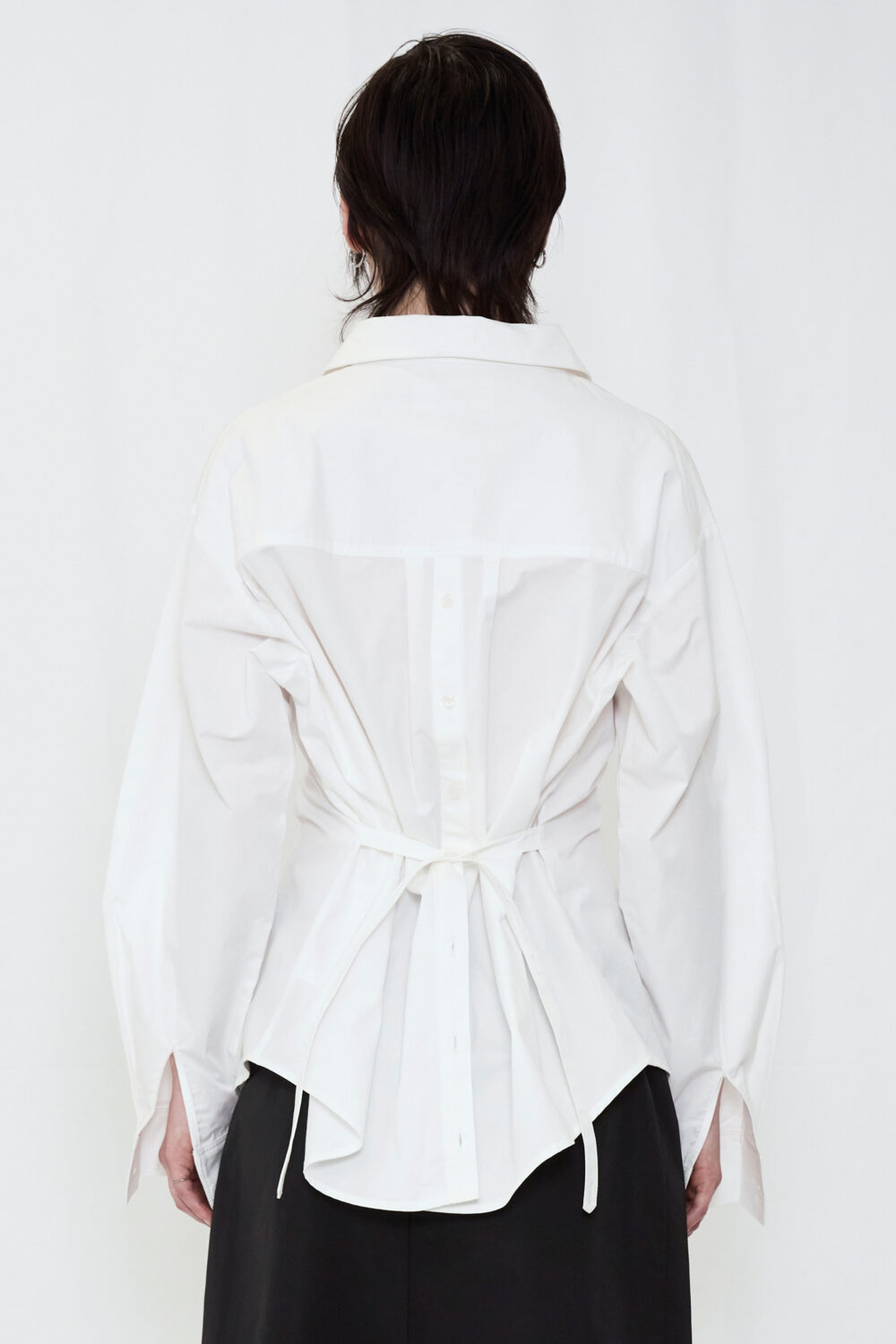 ビッグシルエットでリラックス感を楽しめる一枚ですが、脇に施されたタブを後ろに留める事で、タイトなラインにも変化できるのが魅力。