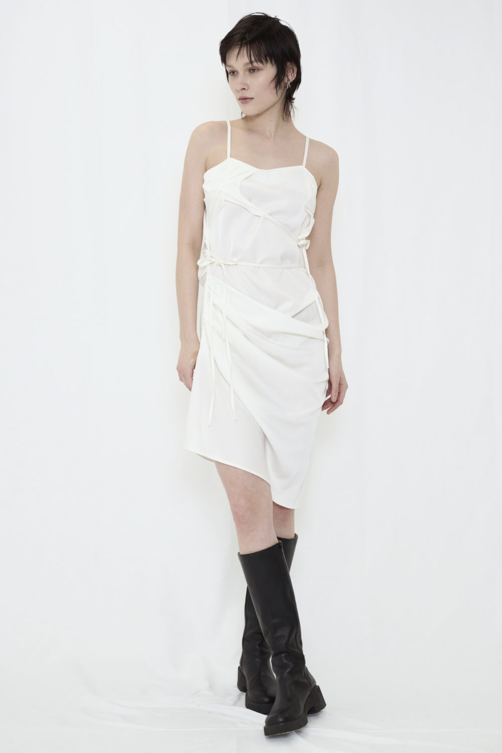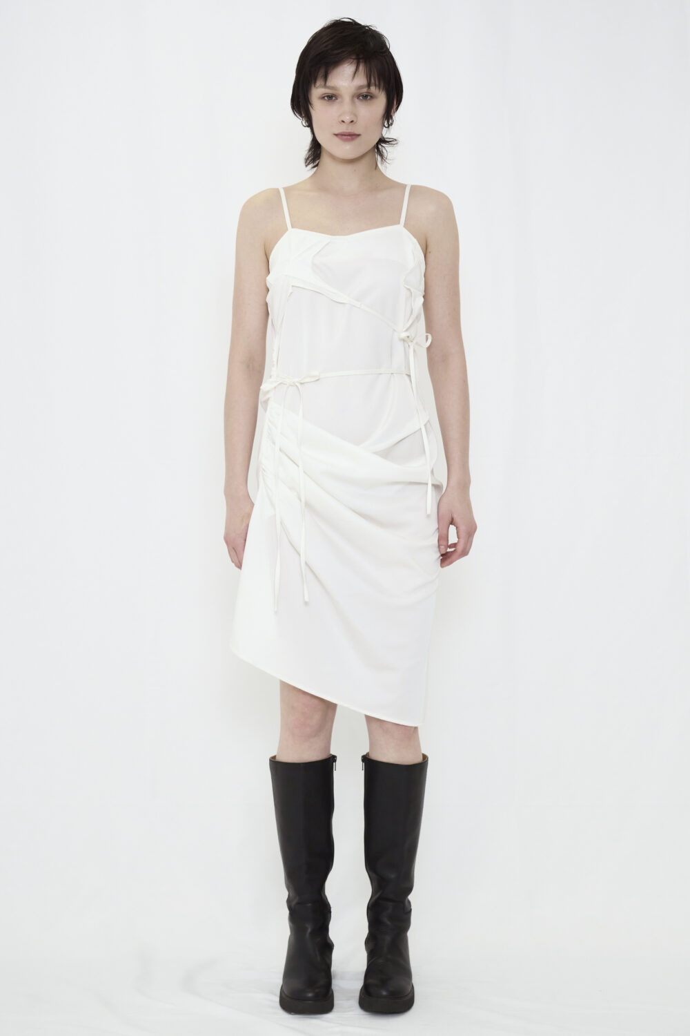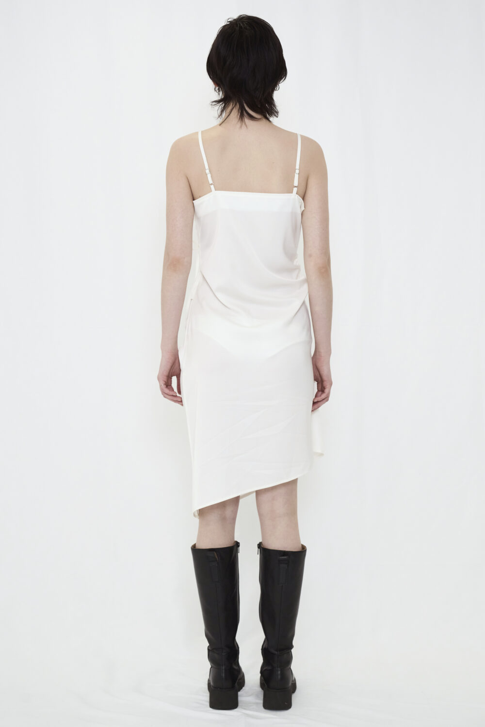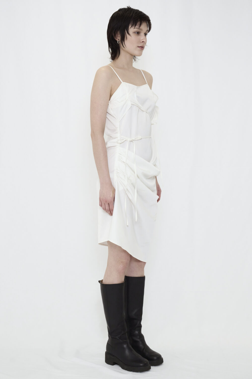 上品な光沢が際立つキャミワンピース。 胸元の繊細な飾りがアクセントになり、ドレープやギャザーが動きのある表情を演出。 華奢な紐のディテールがモダンな抜け感を添え、1枚でもレイヤードでも洗練された印象に。