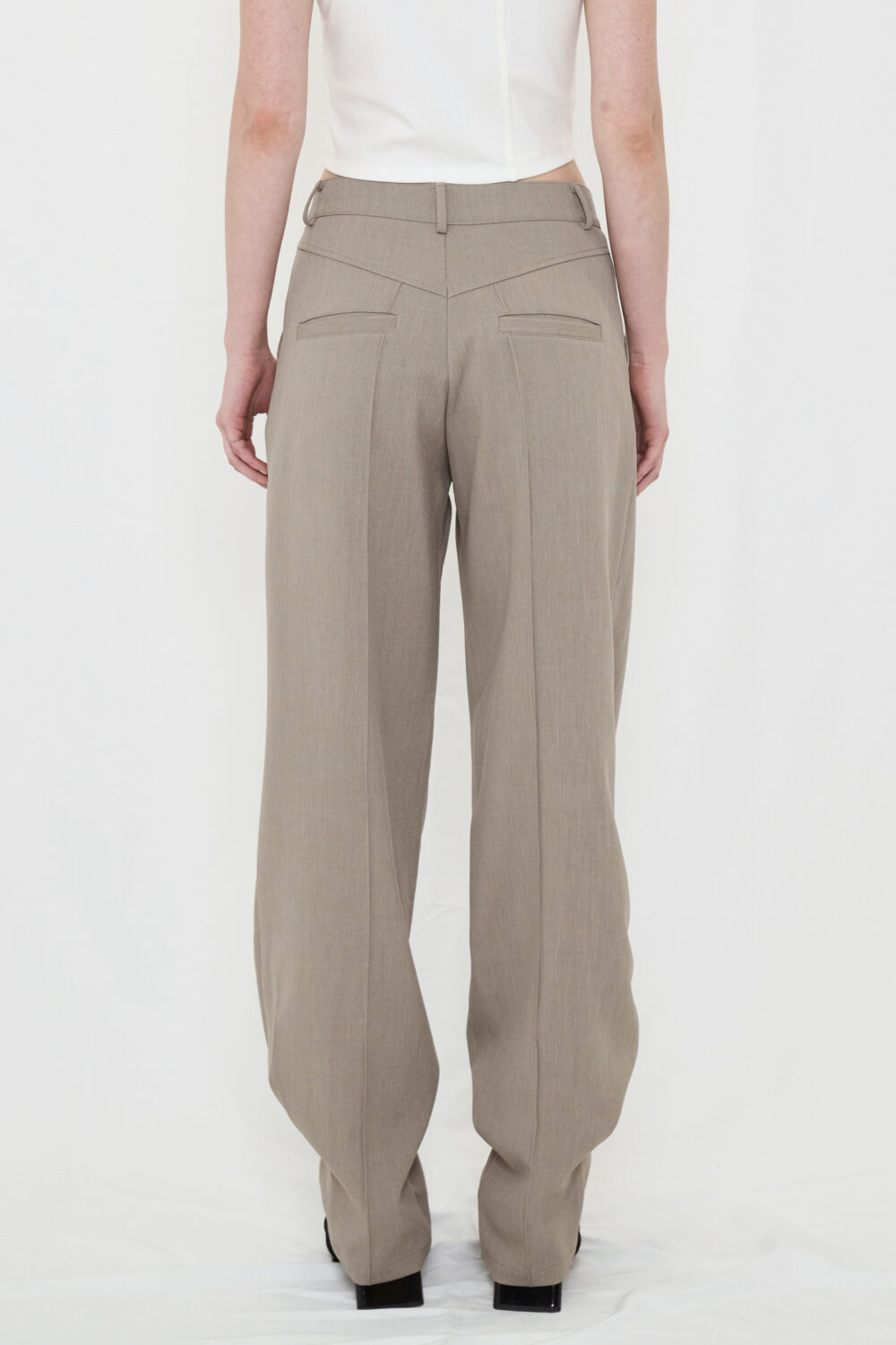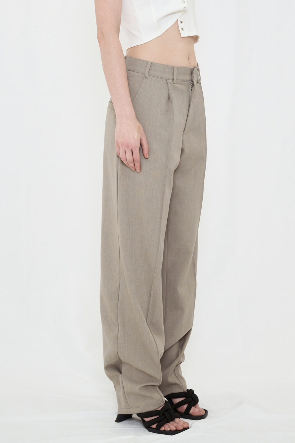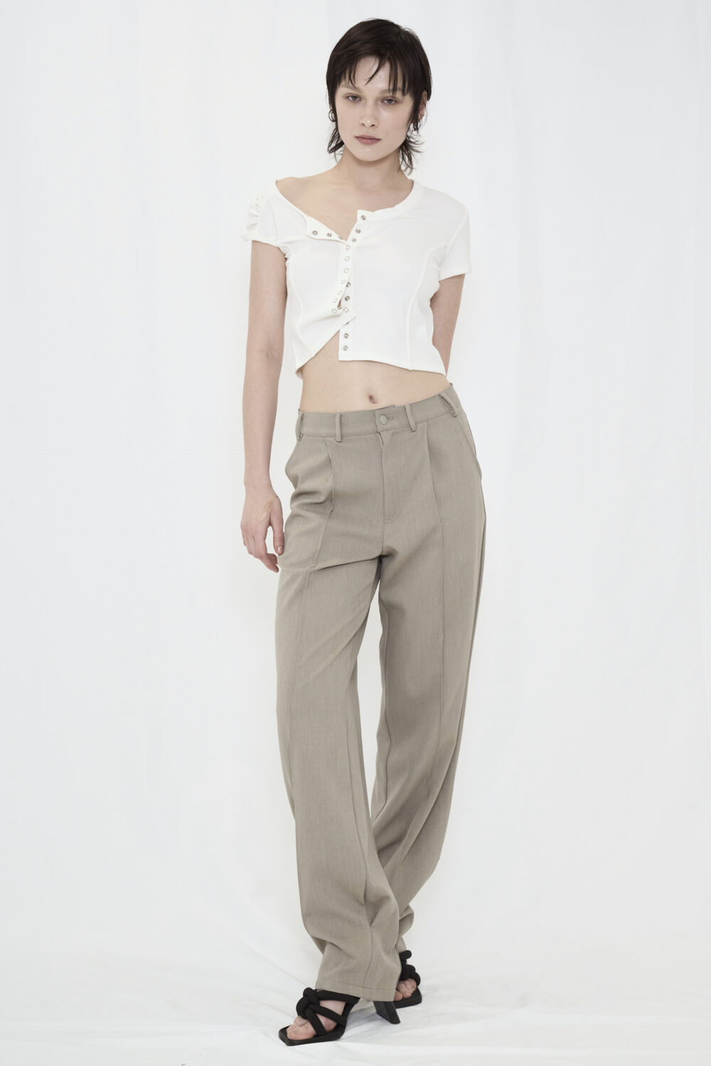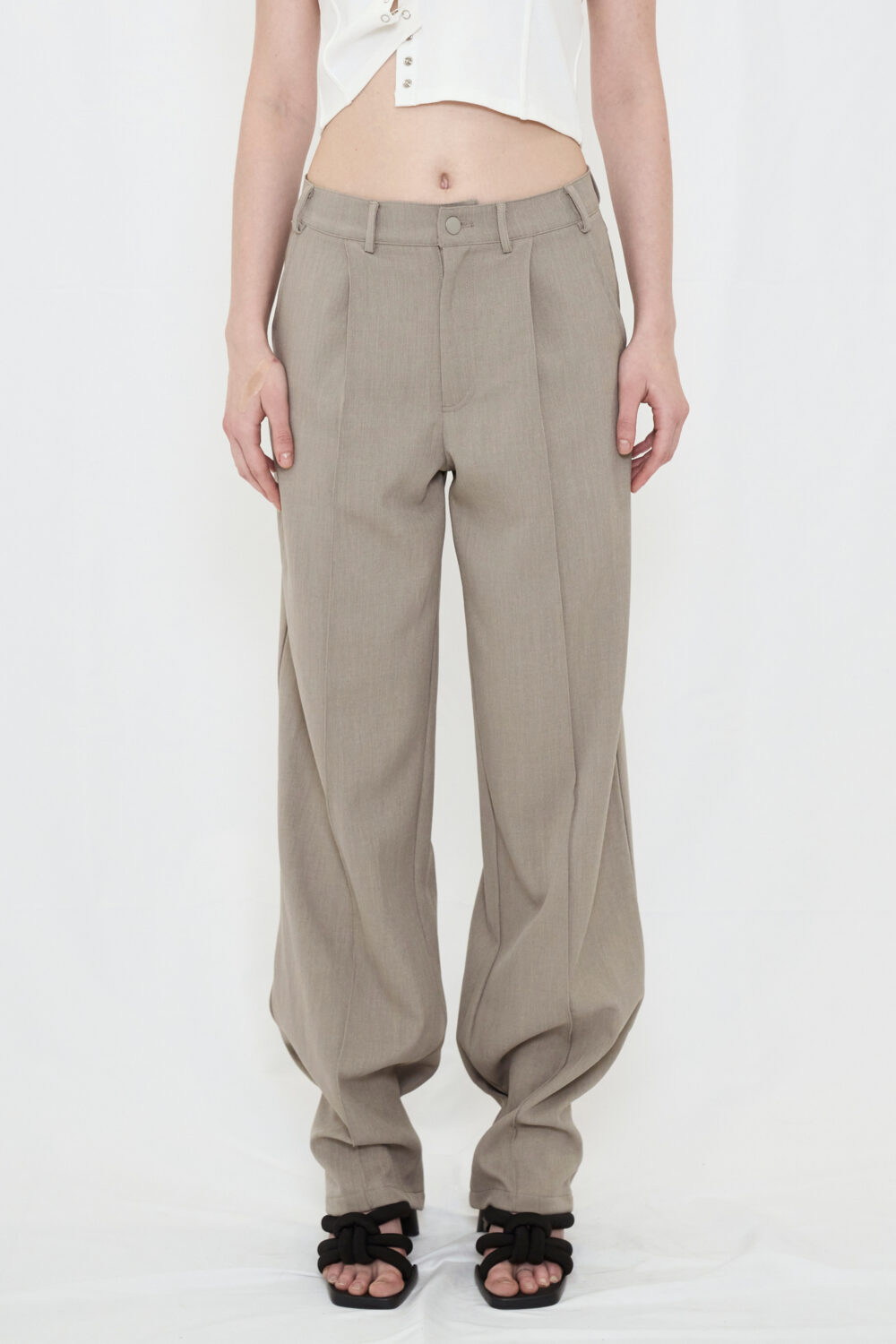 程よい厚みのある生地が美しいフォルムを描き、裾に向かって絞られたシルエットが自然なドレープを生み出す。足元にたまる絶妙なボリューム感は、ブーツからパンプスまで幅広いシューズと好相性。