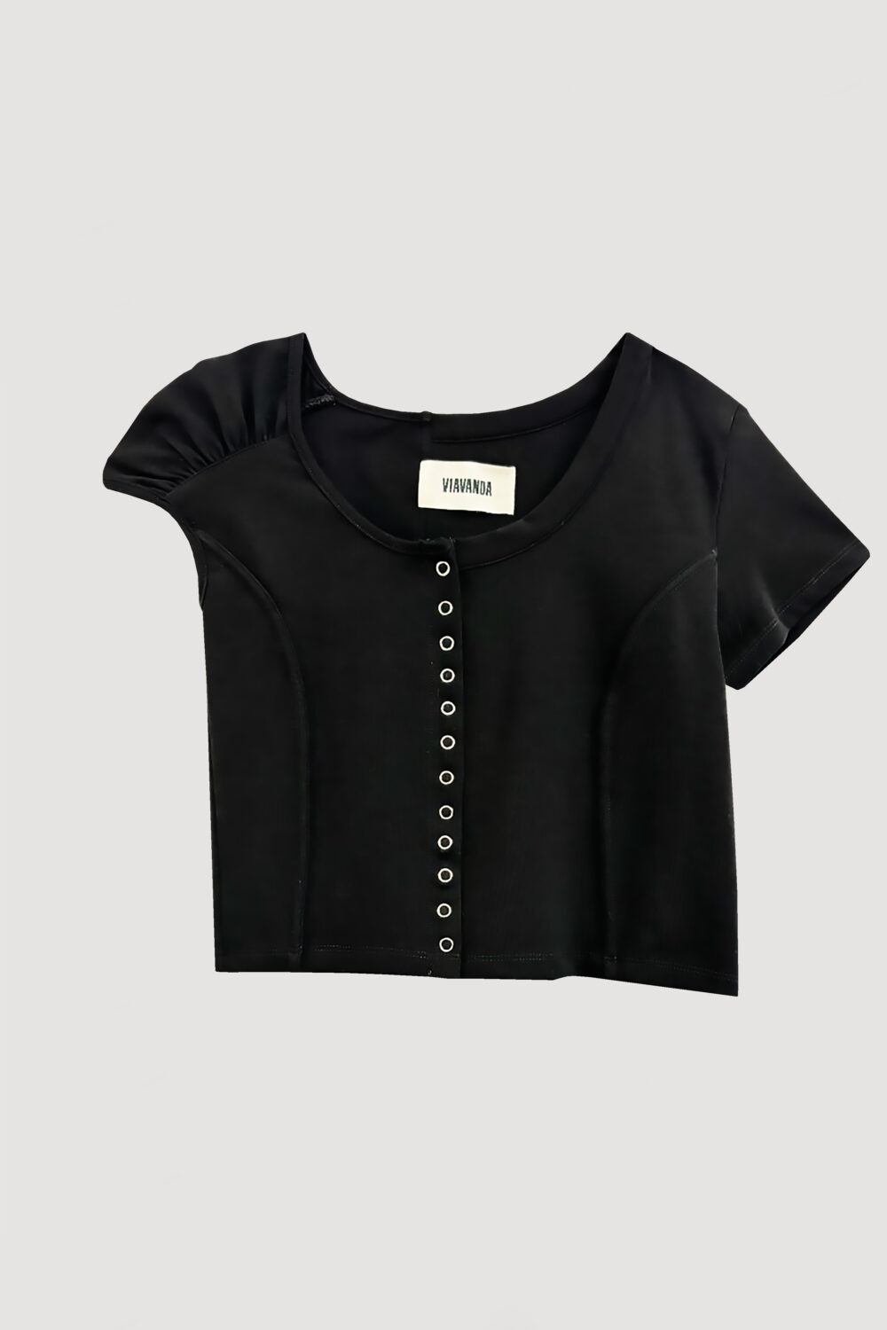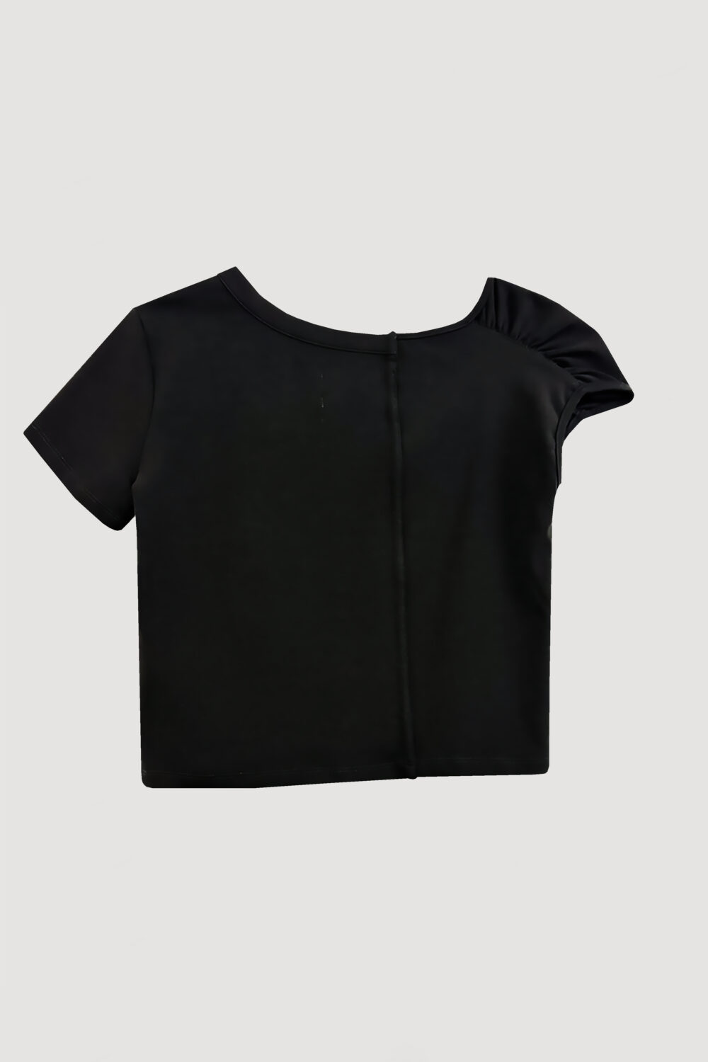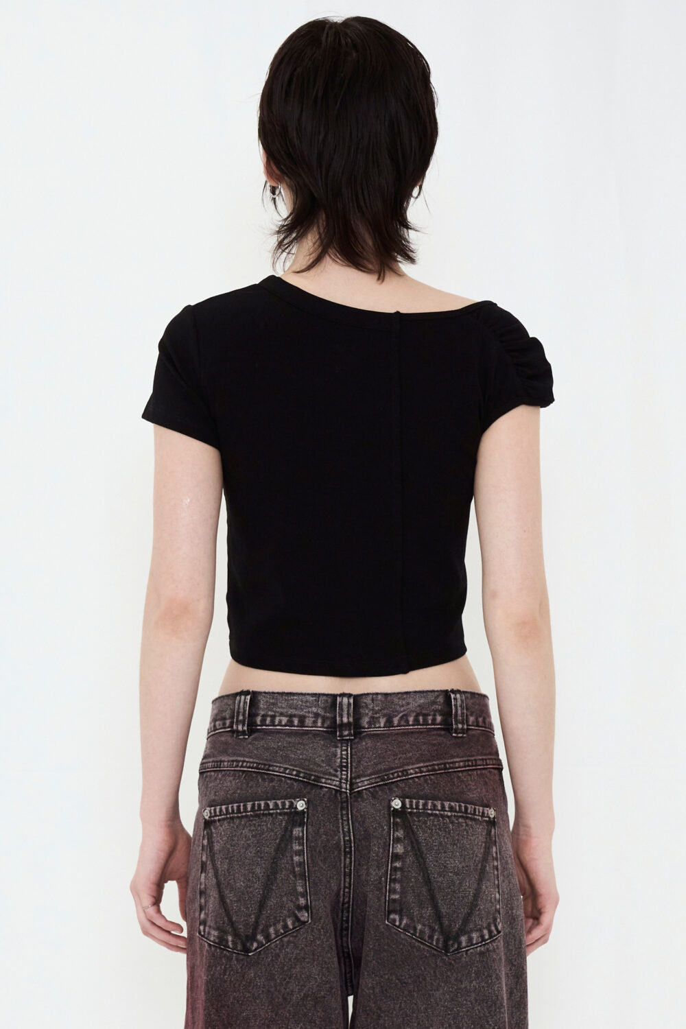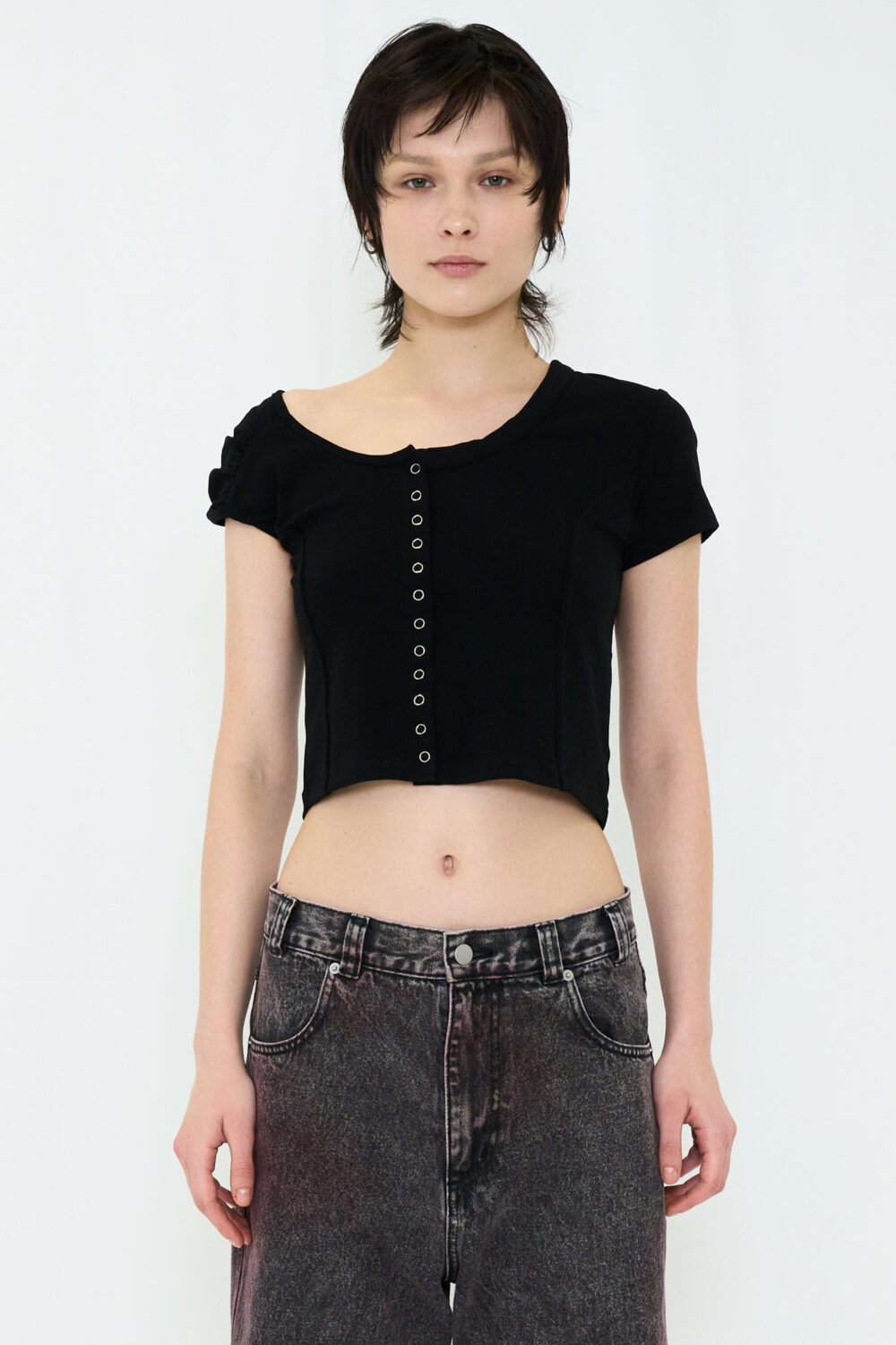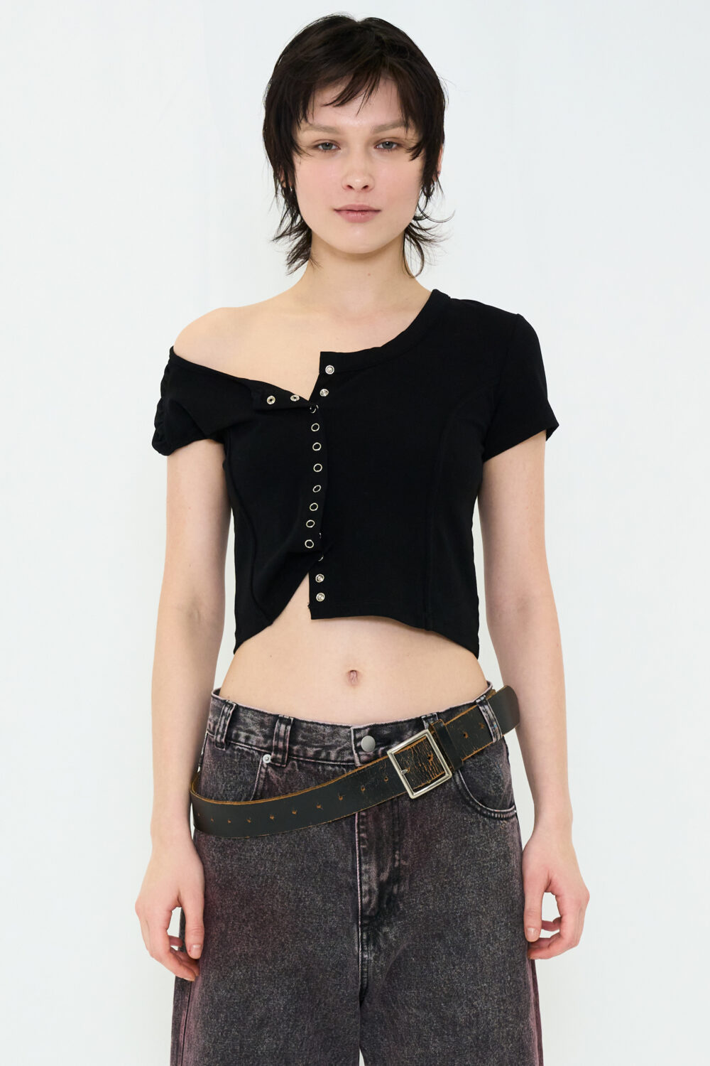 ミニTの概念をアップデートする、遊び心のある一枚。 アシンメトリーな袖が視線を引き寄せ、フロントにはスナップボタンを使用。留め方次第でシルエットや表情を変えられ、着こなしの幅が広がります。