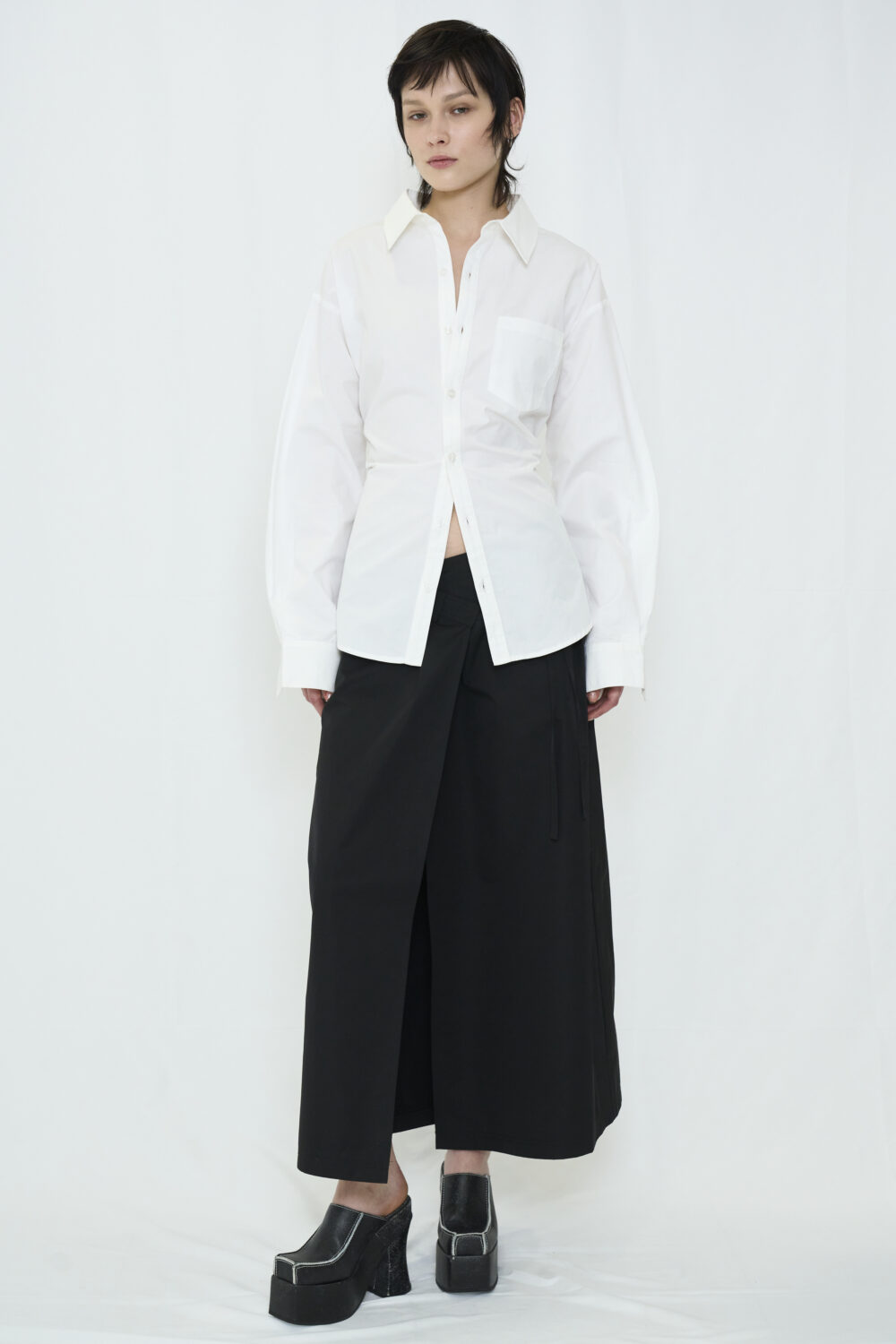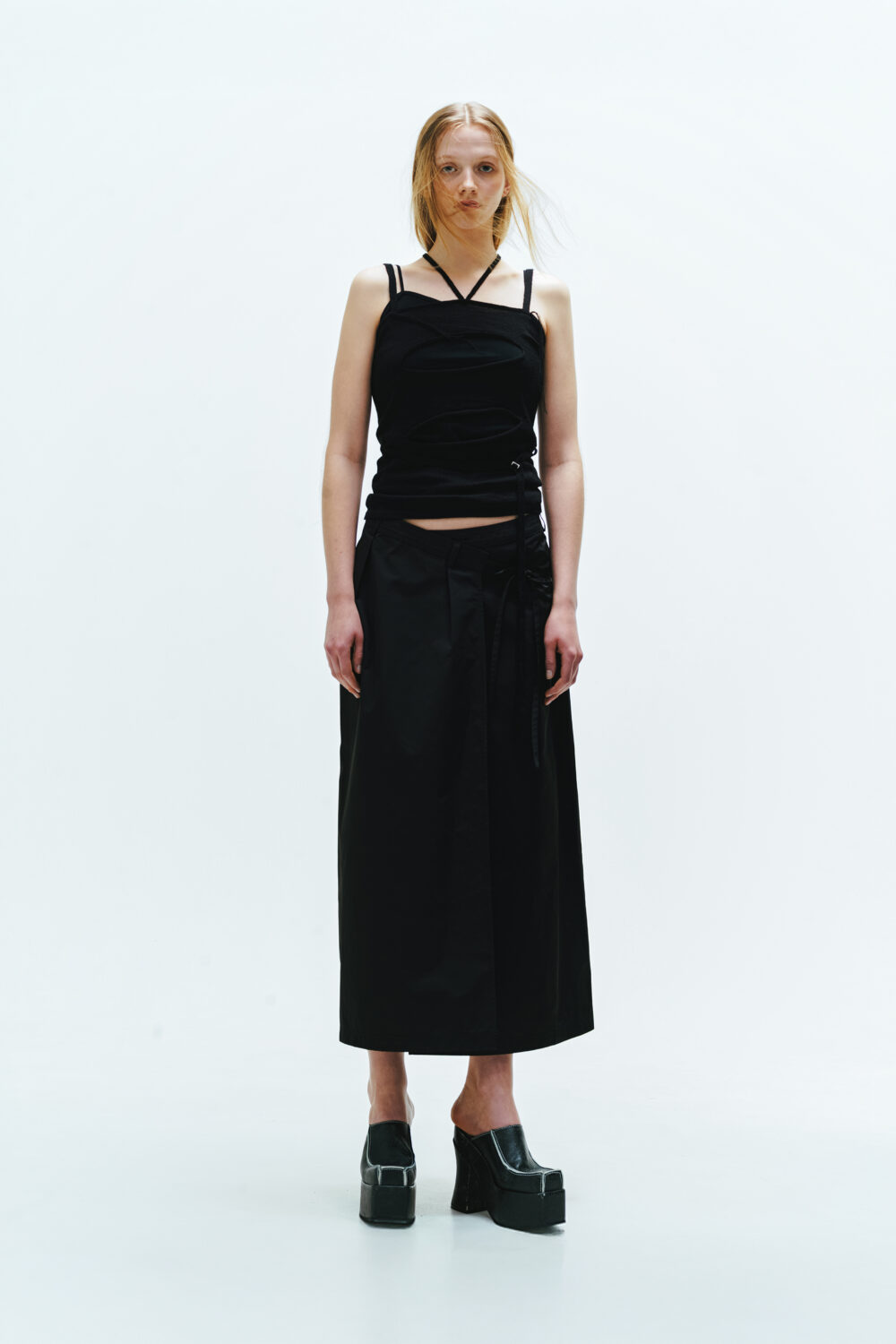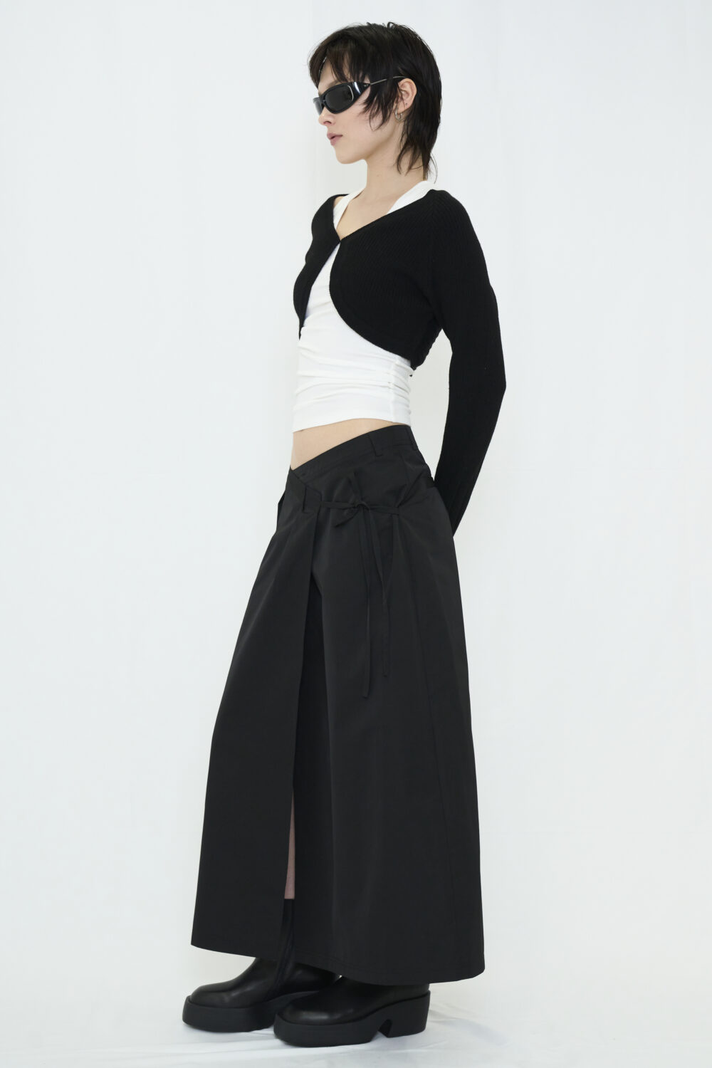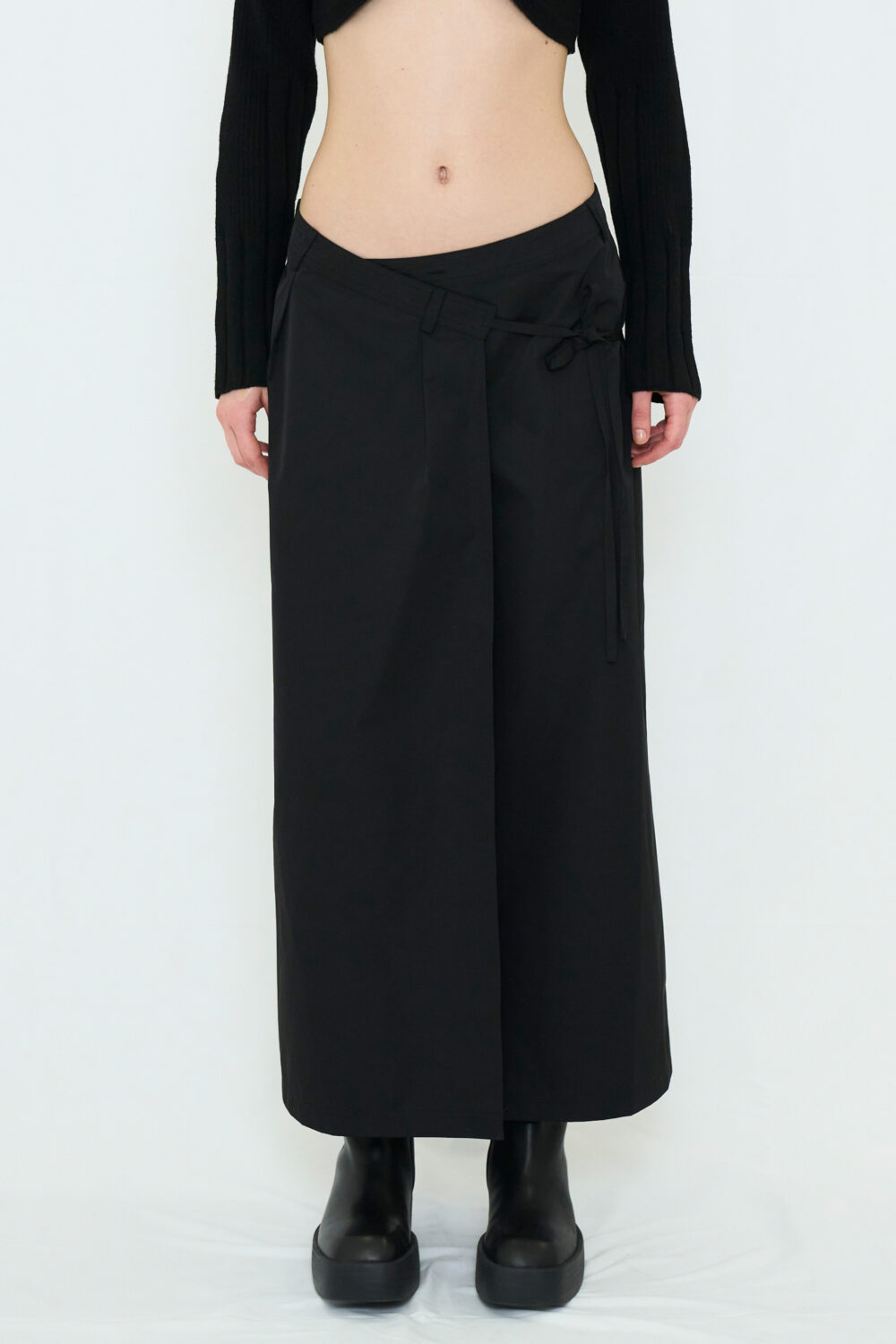 ラップ仕様でフィット感が自在なロングスカート。特徴的なウエストデザインが目を引き、ローライズでもハイウエストでも楽しめます。 ナイロンライクな素材が程よくスポーティな要素を加え、レディになりすぎない絶妙なバランスに。