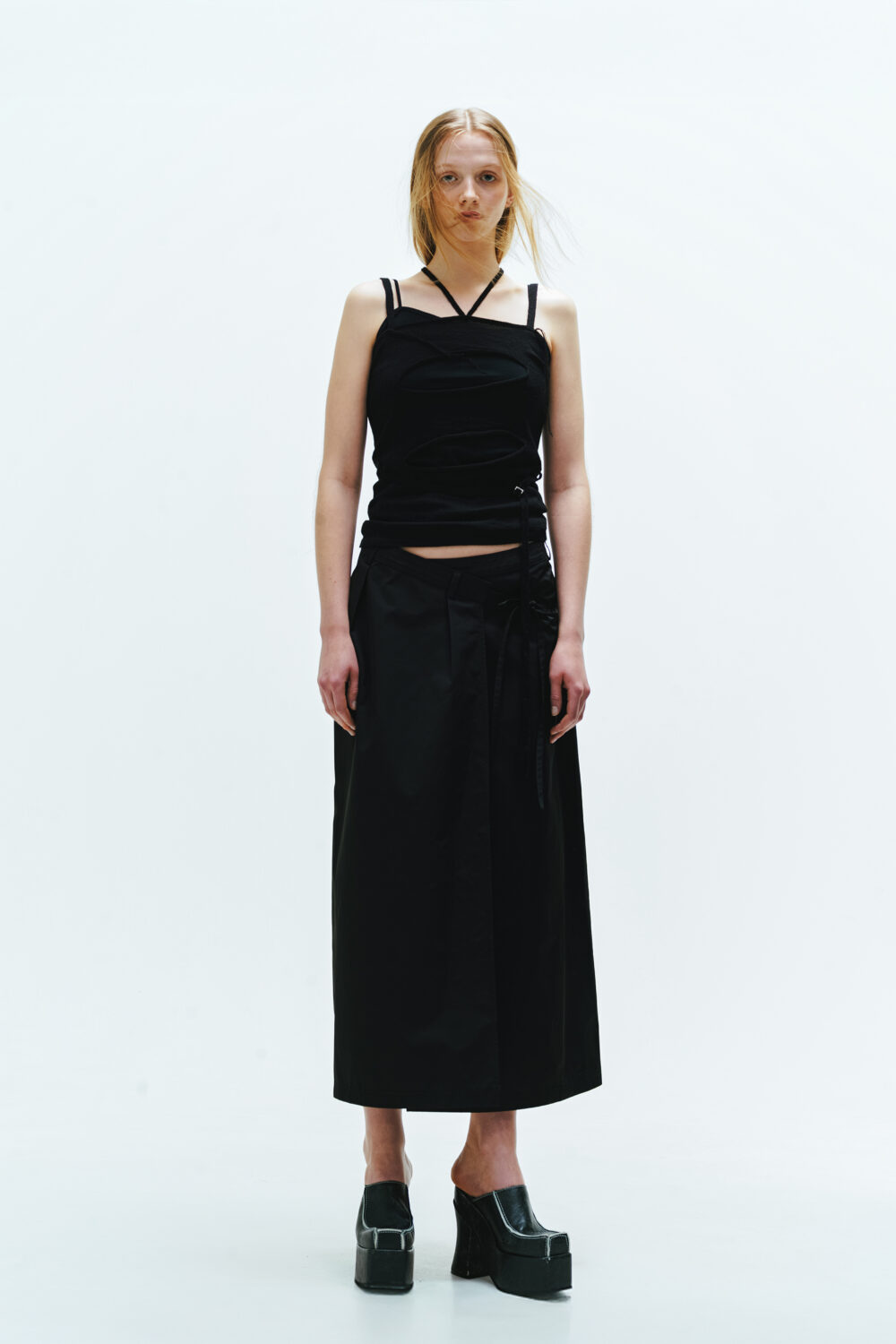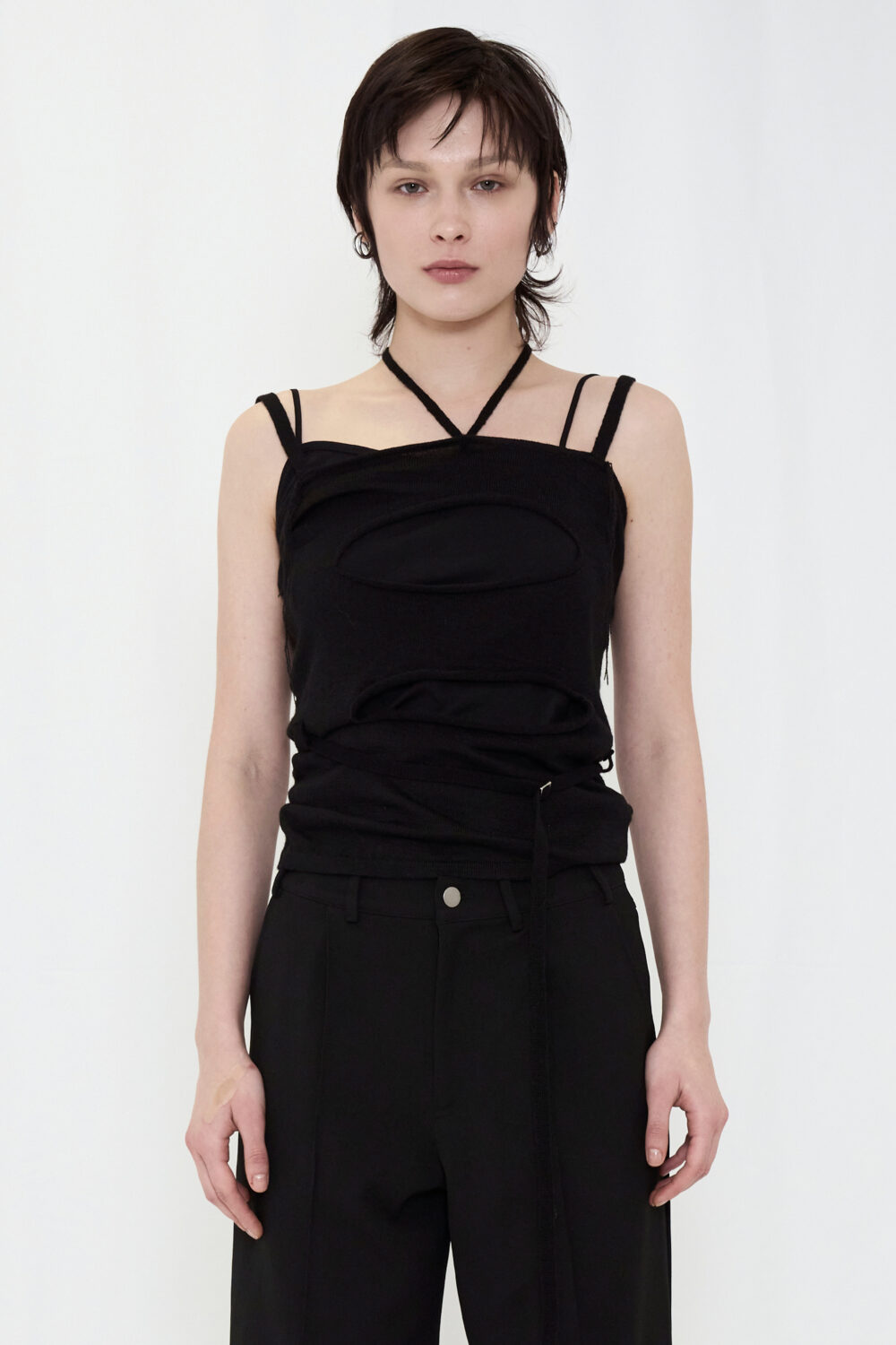 インナーもアシンメトリーなデザインで、単体でも活躍。重ねて立体感を楽しむのはもちろん、それぞれを別のスタイリングに取り入れても◎