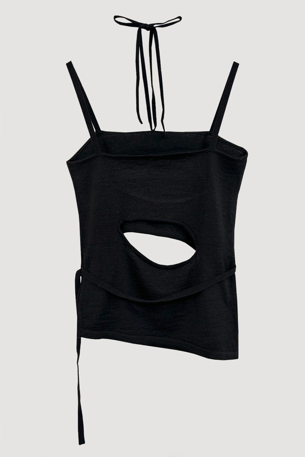 ナチュラルな風合いのウール混ニットキャミは、飾り糸やベルト・大胆なカッティングでVIAVANDAならではのニュアンスをプラス。